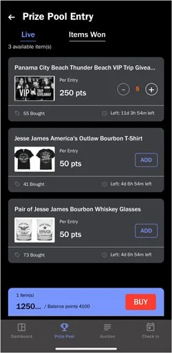 Visit the Auction section of the app. If you see a prize you want, use your points to place a bid! Tap “Place Bid” and us the + and - buttons to adjust your bid amount!