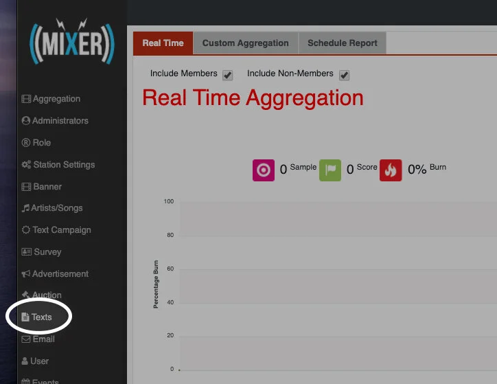 The long-code text interface, simply labeled as “Texts” in the Mixer Admin Backoffice, is where producers or on-air talent can engage directly with listeners in real-time via text message. This is a great way to encourage participation and engagement with both members and non-members. Let’s take a look: