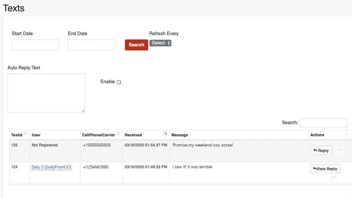 Click the “Texts” link, and you’ll be taken to the text dashboard. The text dashboard will look similar to fig. 2.