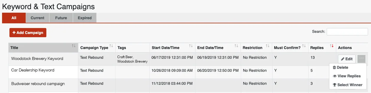 To view progress or choose a campaign winner, return to the main Keyword & Text Campaign screen. Note the column titled “Replies.” This will show you the total number of replies received. See fig. 5.